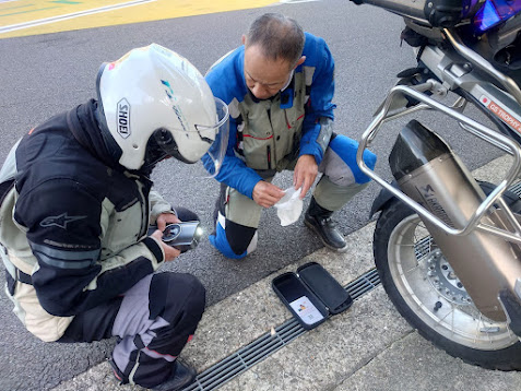 BCN東海メンバーのパンク修理は慣れたもの。直ぐに修理をして問題はありません。
