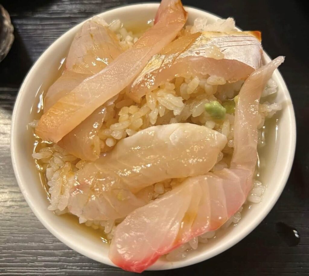 東海地区会長の鈴木氏お勧め、お刺身盛りだくさんの鯛茶漬け。美味しそうです。