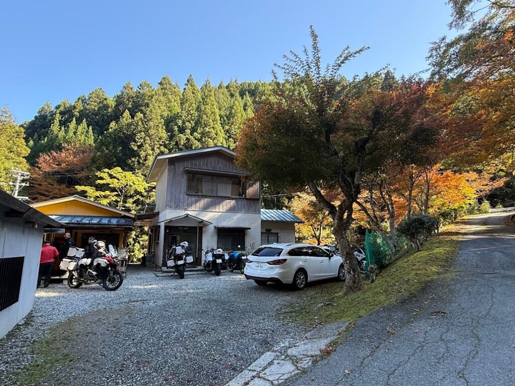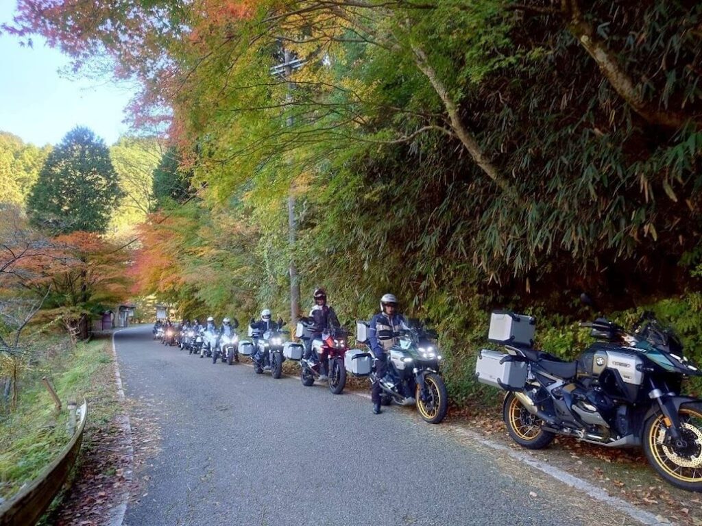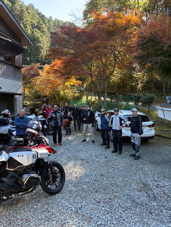 カフェ付近で記念撮影。紅葉効果でバイクがより映えます。